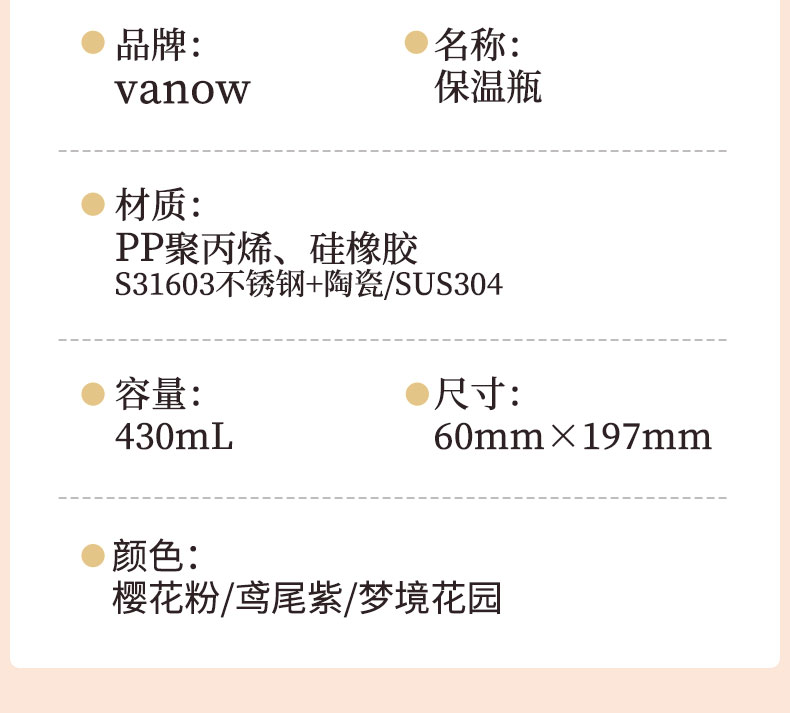 Vanow保溫瓶不銹鋼內(nèi)膽430mlVO-YW43BW