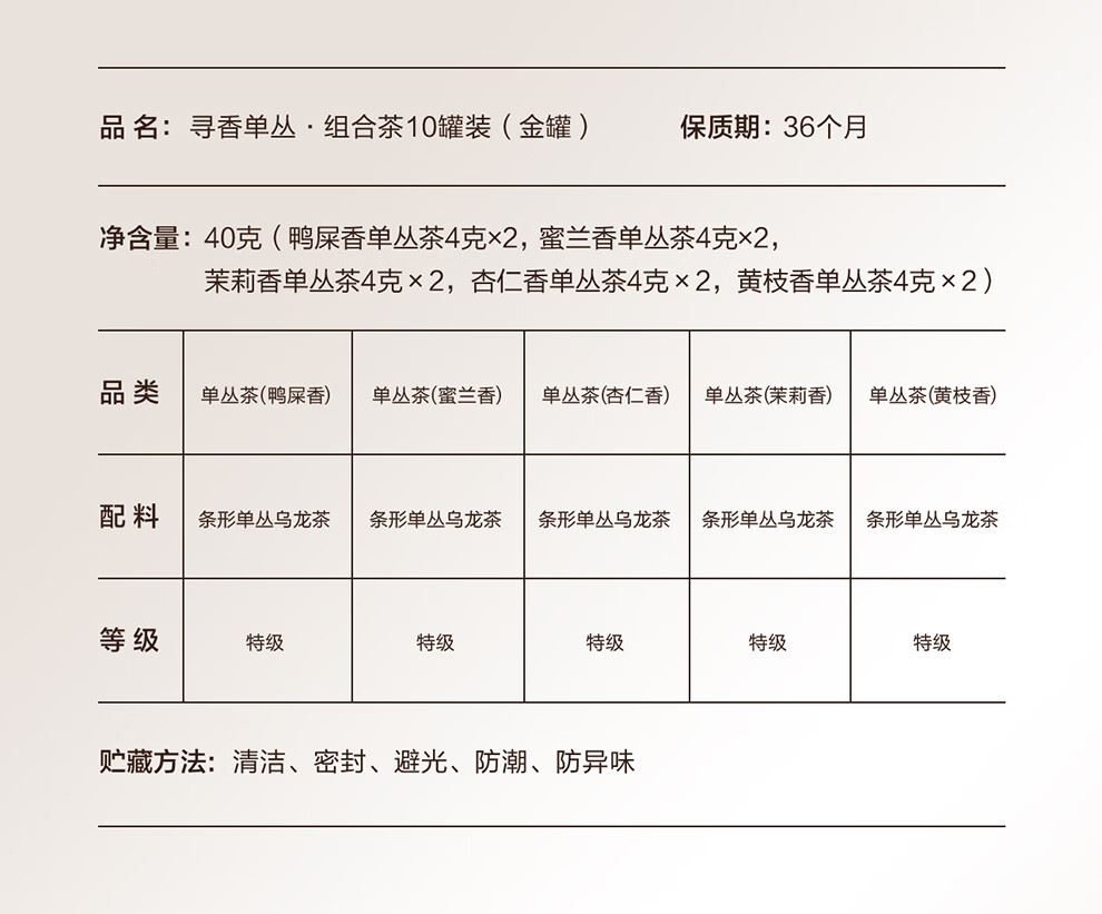 凈含量:40克(鴨屎香單叢茶4克x2,蜜蘭香單叢茶4克x2,茉莉香單叢茶4克x2,杏仁香單叢茶4克x2,黃枝香單叢茶4克x2)