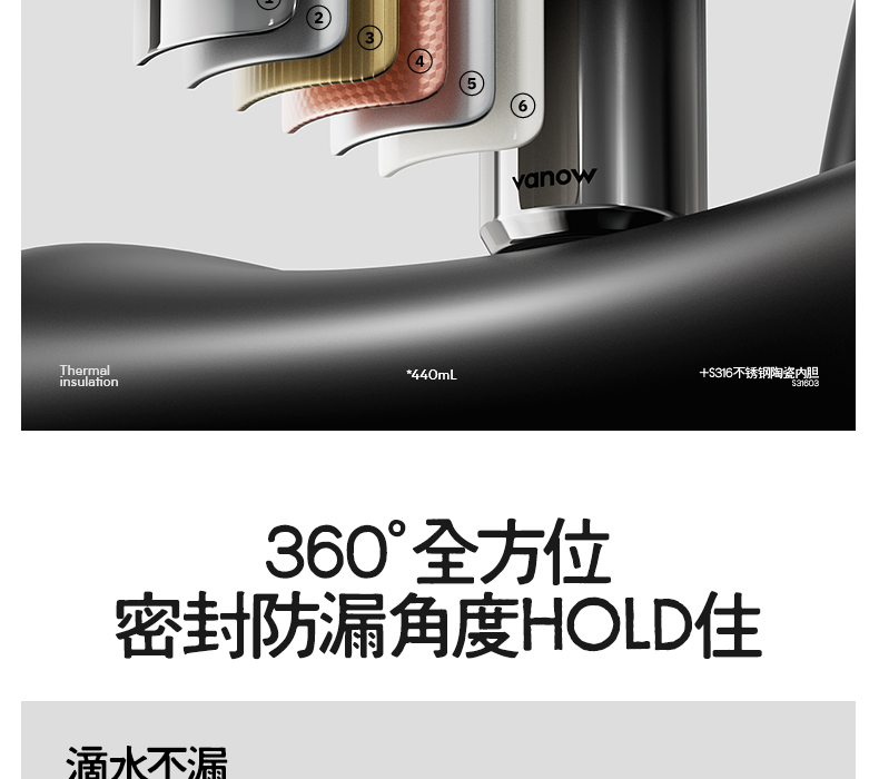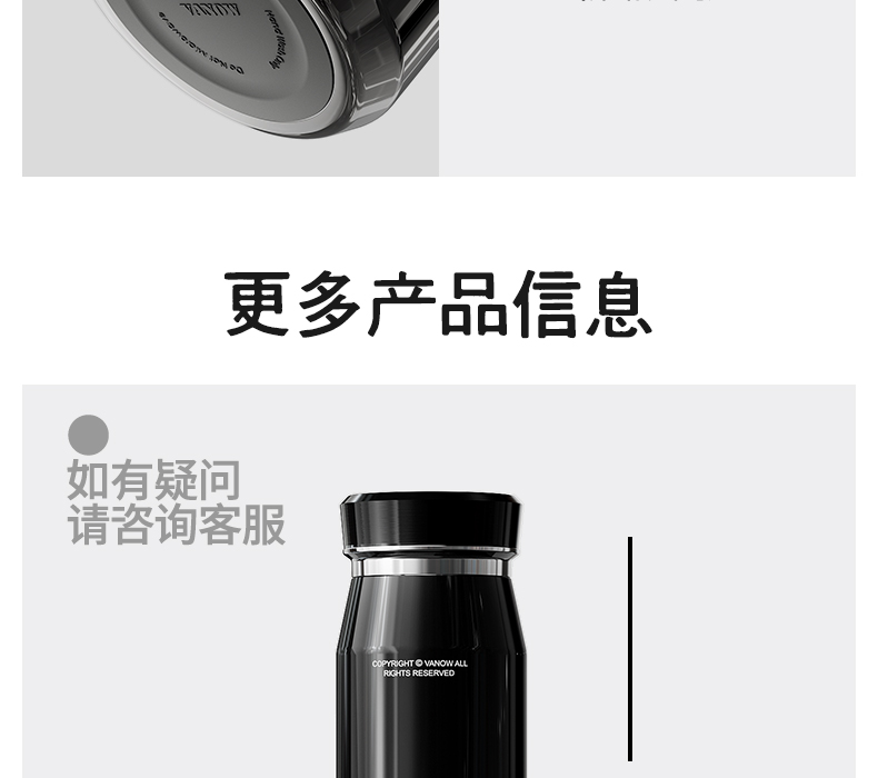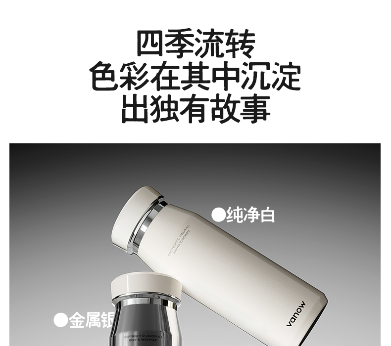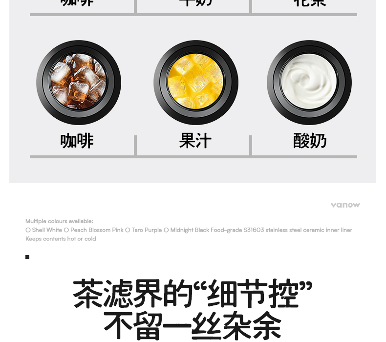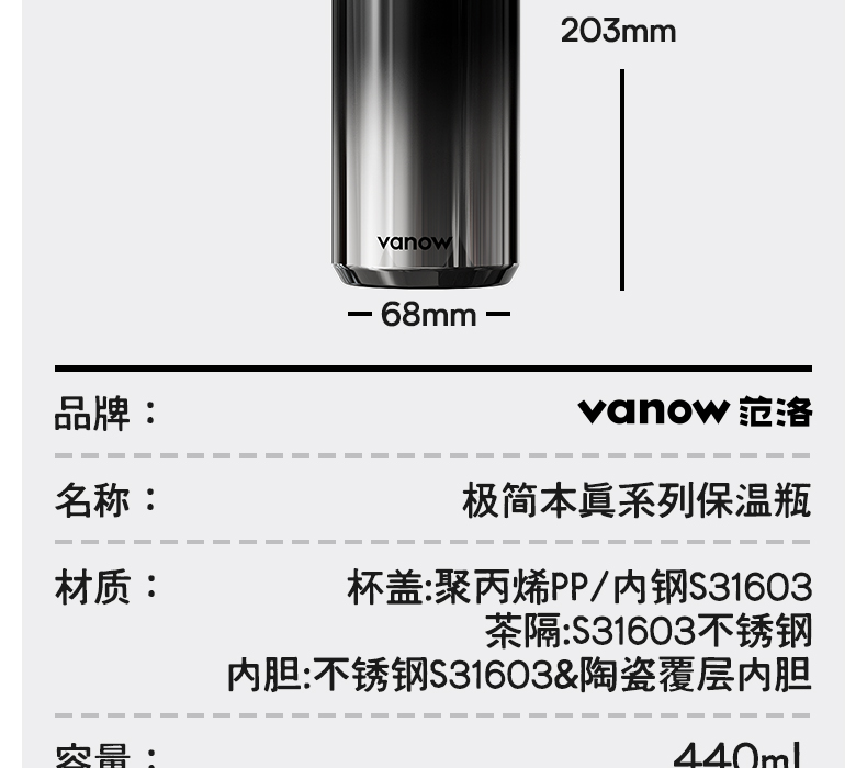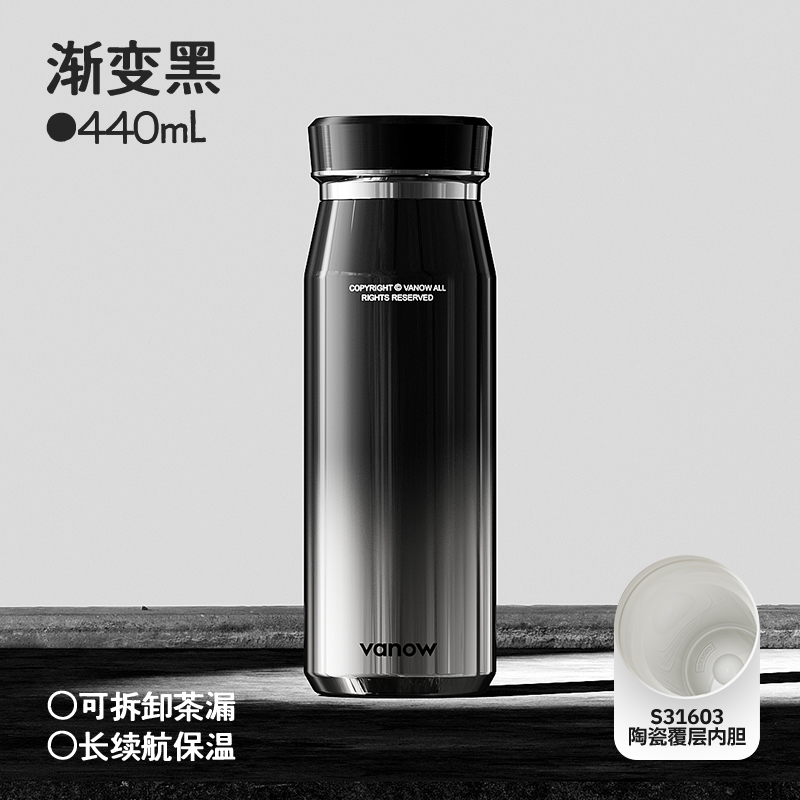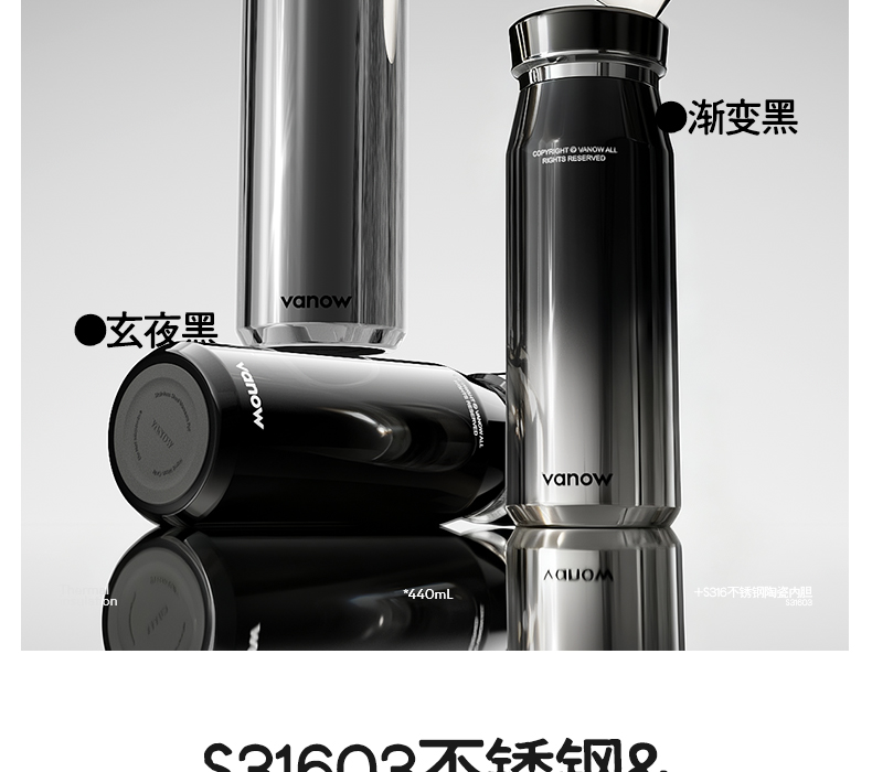 型號:VO-JZ44JBW-C 顏色:漸變黑, 純凈白, 金屬銀, 玄夜黑 容量:440ml 尺寸:203*68mm 材質(zhì):316不銹鋼陶瓷覆層內(nèi)膽覆層,聚丙烯pp