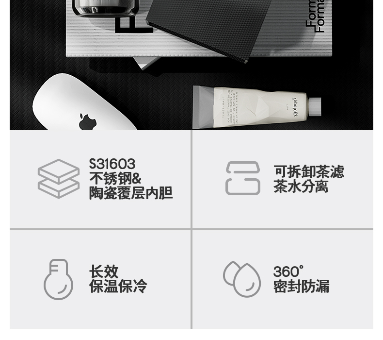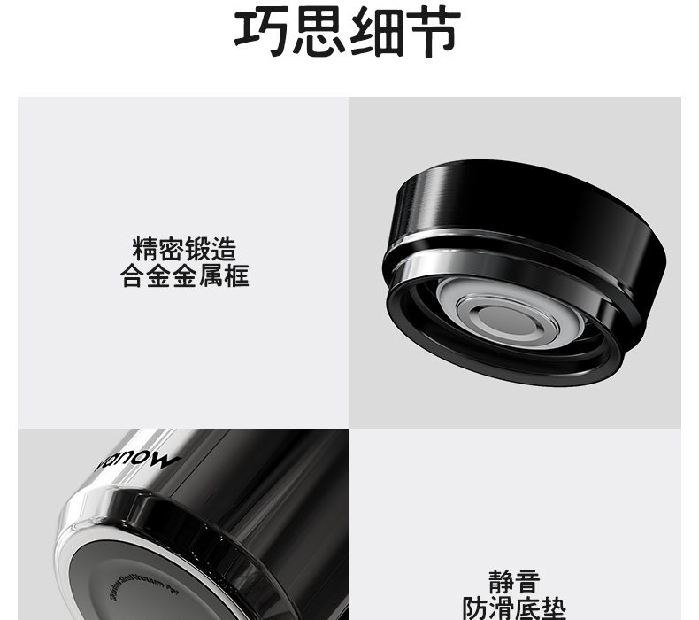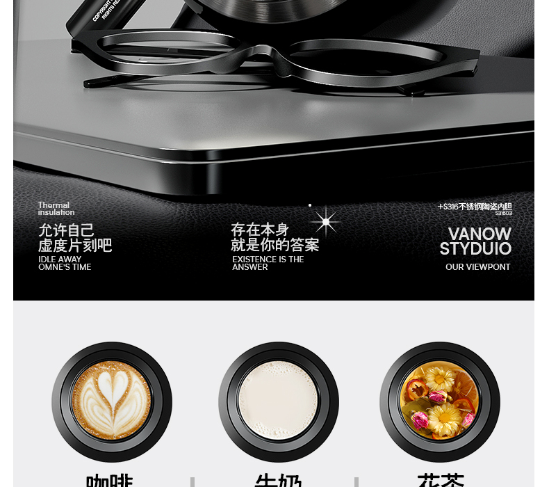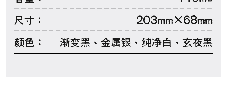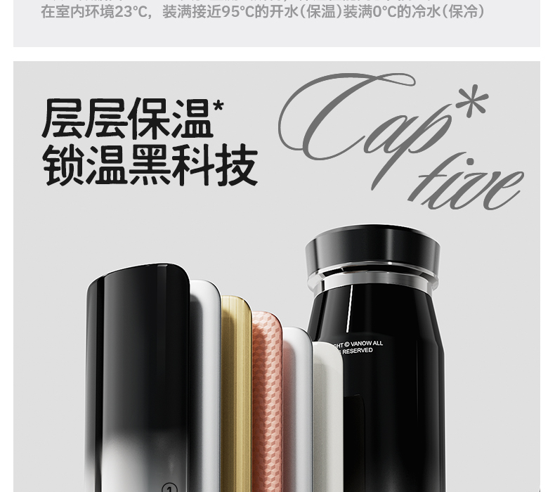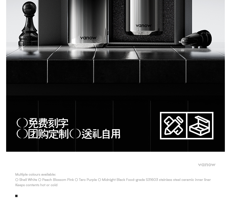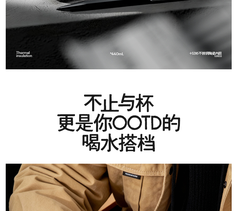 型號:VO-JZ44JBW-C 顏色:漸變黑, 純凈白, 金屬銀, 玄夜黑 容量:440ml 尺寸:203*68mm 材質(zhì):316不銹鋼陶瓷覆層內(nèi)膽覆層,聚丙烯pp