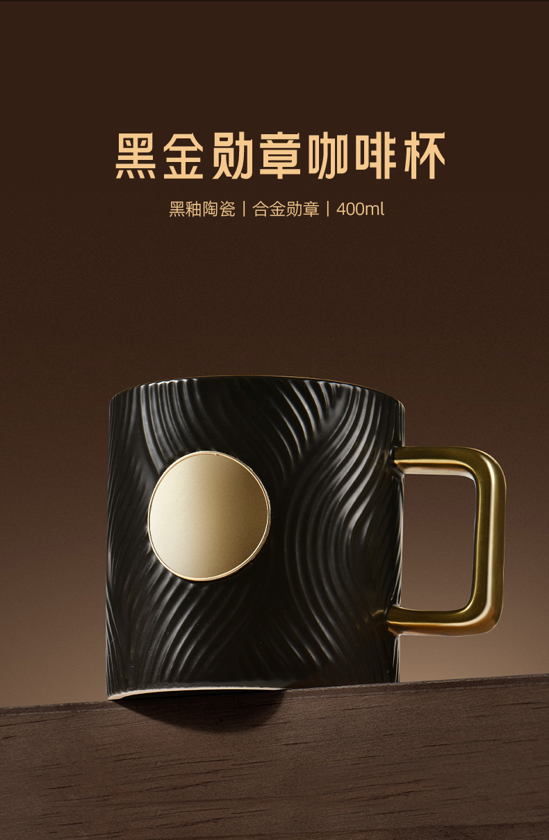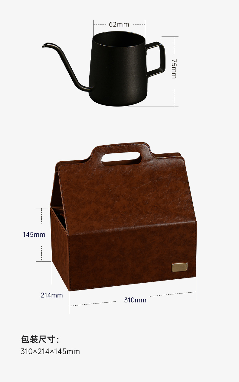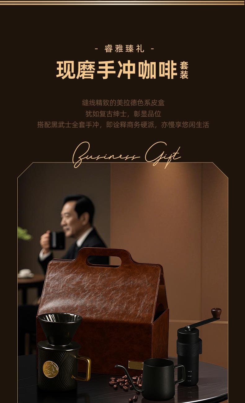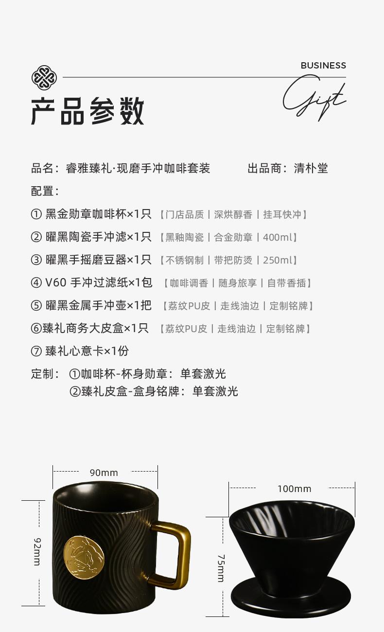 配置 · ① 黑金勛章咖啡杯×1只 【黑釉陶瓷丨合金勛章丨400ml】 ② 曜黑陶瓷手沖濾×1只 【黑釉陶瓷丨螺紋導(dǎo)流槽丨大單孔】 ③ 曜黑手搖磨豆器×1只 【精瓷磨芯丨不銹鋼制丨實木柄珠】 ④ V60 手沖過濾紙×1包 【不析出丨無膠鎖邊丨純木纖維】 ⑤ 曜黑金屬手沖壺×1把 【不銹鋼制丨帶把防燙丨250ml】 ⑥ 臻禮商務(wù)大皮盒×1只 【荔紋PU皮丨走線油邊丨定制銘牌】 ⑦ 臻禮心意卡×1份