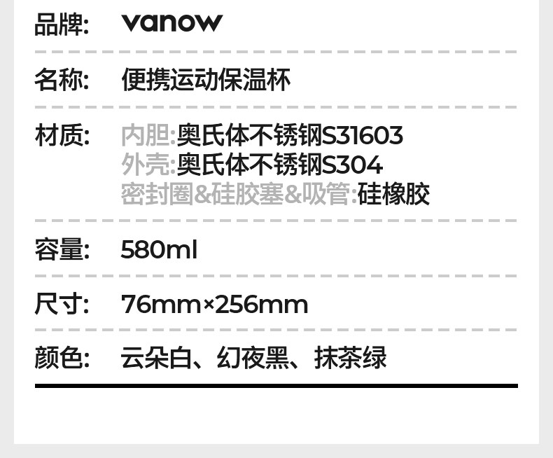 顏色:云朵白,幻夜黑,抹茶綠 容量:580ml 尺寸:76*256mm 材質(zhì):SUS316不銹鋼/硅橡膠