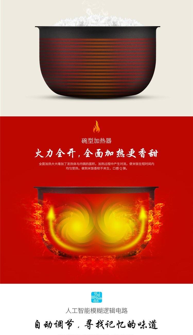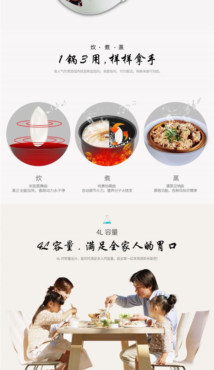 類(lèi)別:家用電飯煲; 操作方式:按鍵式: 容量:4L; 功能:預(yù)約,蛋糕,粥,燉湯;內(nèi)膽材質(zhì):黑晶;加熱方式:三維立體加熱; 包裝清單: 電飯煲、內(nèi)膽、調(diào)理盤(pán)、飯勺、湯勺、說(shuō)明書(shū)、質(zhì)??ā⑹匙V。