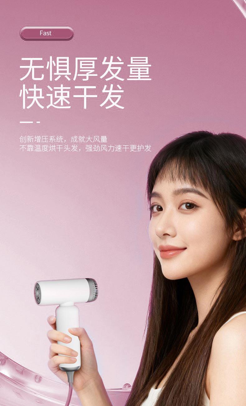 3.創(chuàng)新增壓系統(tǒng),成就大風(fēng)量不靠溫度烘干頭發(fā),強(qiáng)勁風(fēng)力速干更護(hù)發(fā);