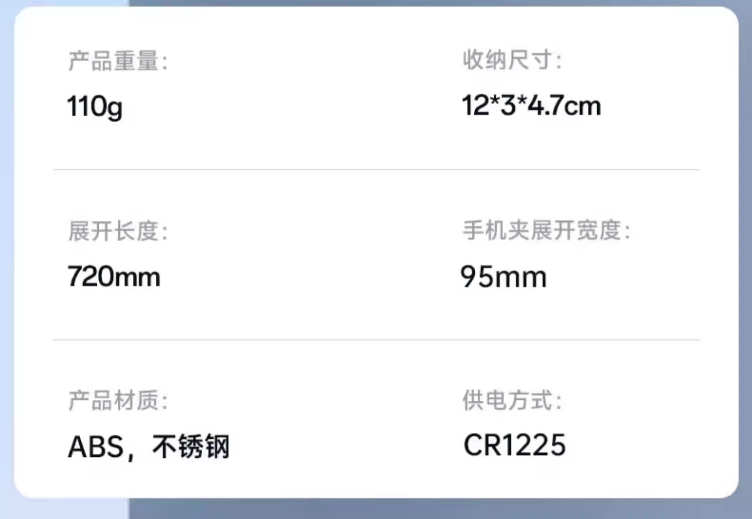 產(chǎn)品顏色:白色 供電方式:GR1225 適用型號:所有智能手機 材質(zhì):不銹鋼+ABS 產(chǎn)品尺寸:120*30*47mm 彩盒尺寸:50*34*127mm 整箱數(shù)量:100/箱 產(chǎn)品重量:約110克