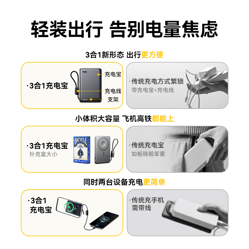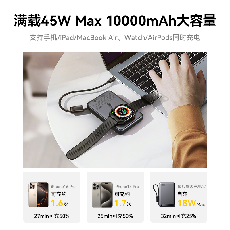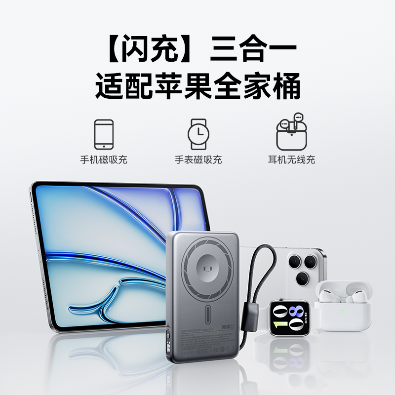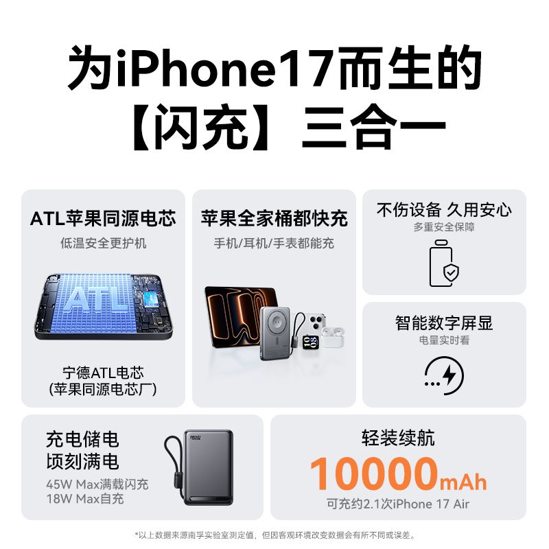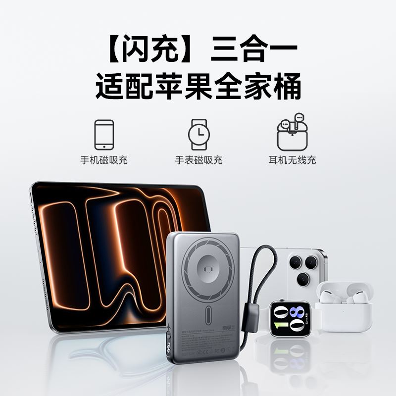 型號:C1103 產(chǎn)品顏色;深空灰/珍珠白 材質(zhì):PC+ABS 電池容量:10000mAh 自帶線功率適用:45W PD有線輸出 15W 磁吸無線充(重點兼容iPhone 15/16/17,Airpods3/4) 5W手表無線充(重點兼容apple watch 7/8/9/10/Ultra2)芯片:寧德時代雙ATL電芯/蘋果同廠電芯