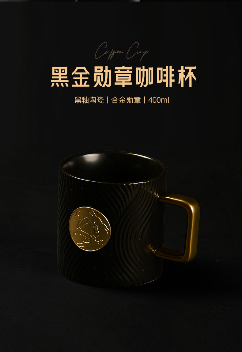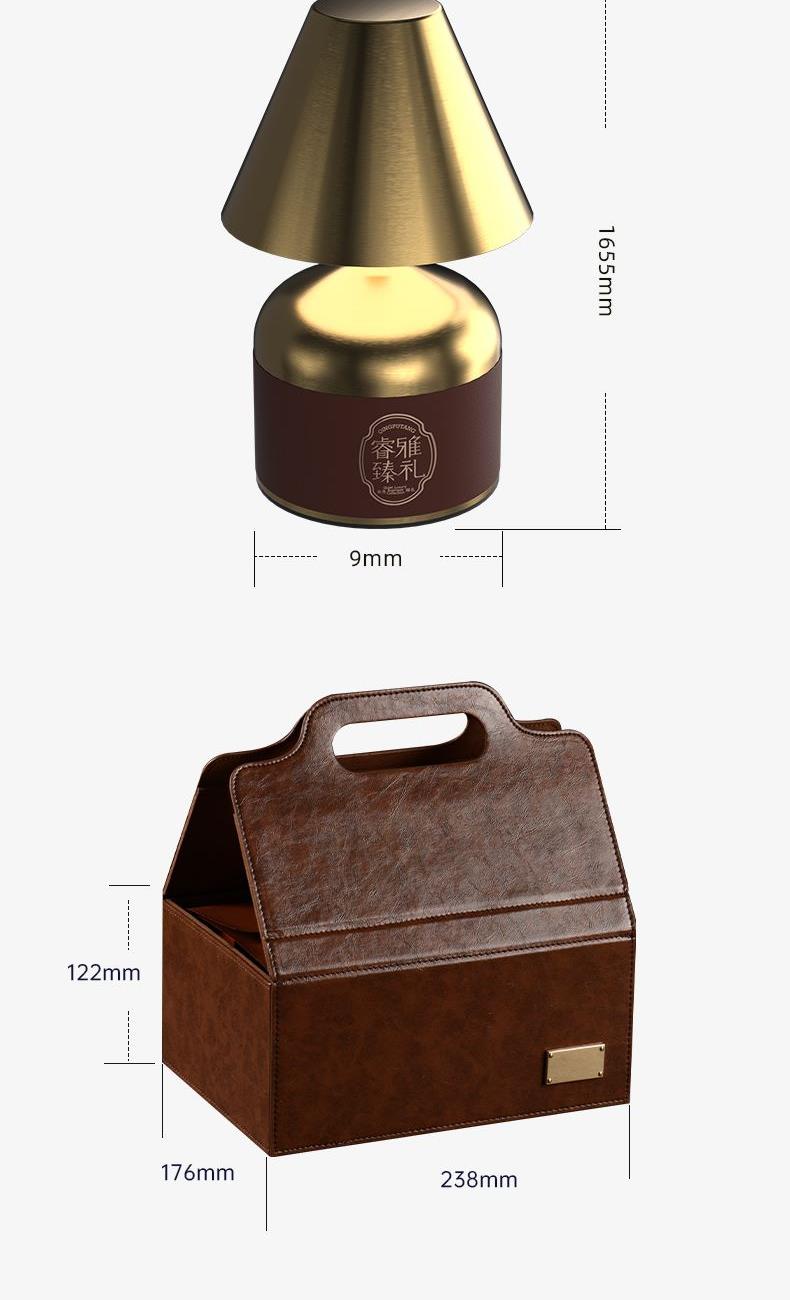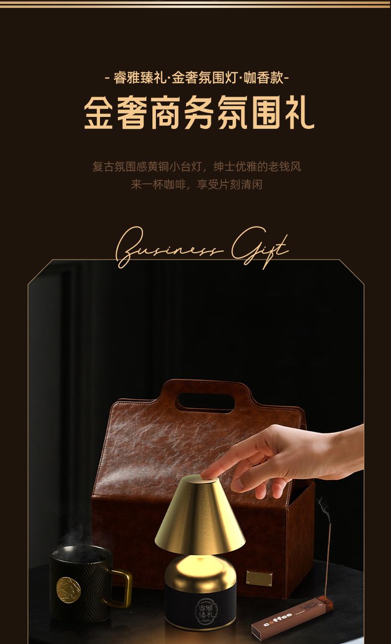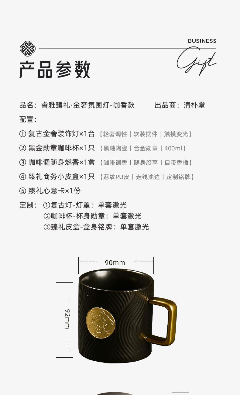 配置 · ① 復(fù)古金奢裝飾燈×1臺 【輕奢調(diào)性丨軟裝擺件丨觸摸變光】 ② 黑金勛章咖啡杯×1只 【黑釉陶瓷丨合金勛章丨400ml】 ③ 咖啡調(diào)隨身燃香×1盒 【咖啡調(diào)香丨隨身旅享丨自帶香插】 ④ 臻禮商務(wù)小皮盒×1只 【荔紋PU皮丨走線油邊丨定制銘牌】 ⑤ 臻禮心意卡×1份