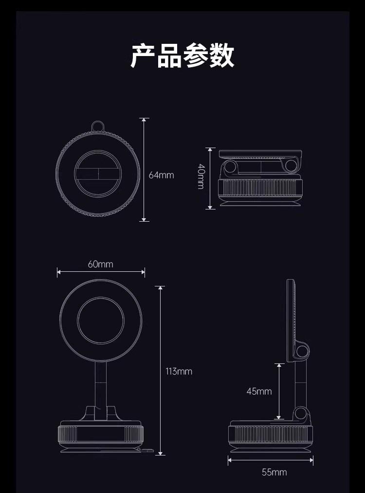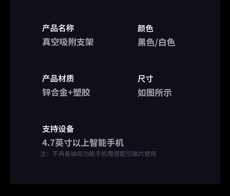產(chǎn)品材質(zhì):鋅合金++塑膠 顏色:黑色/白色 支持設(shè)備:4.7英寸以上智能手機(jī) 適用:汽車中控臺(tái),玻璃面,金屬面,光滑的瓷磚和不銹鋼面、桌面 折疊尺寸:64*64*40mm 包裝尺寸:79x38x90mm 整箱數(shù)量:100/箱 產(chǎn)品重量:100g