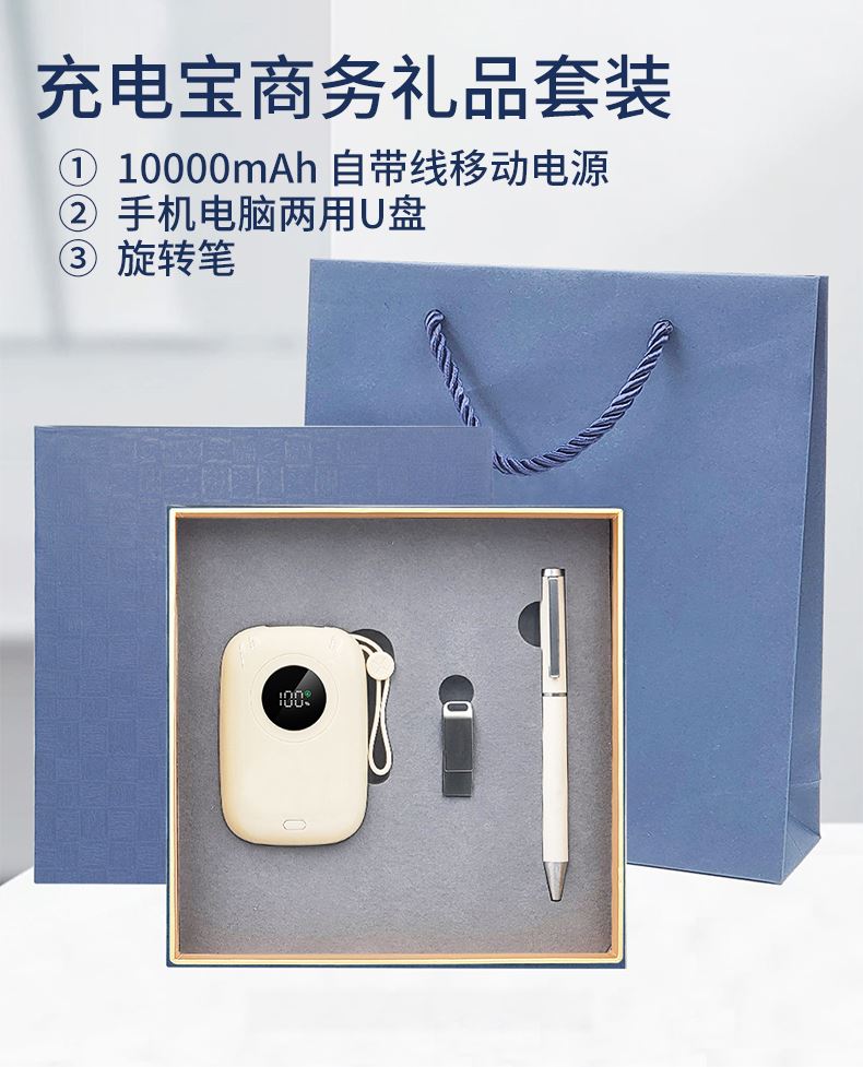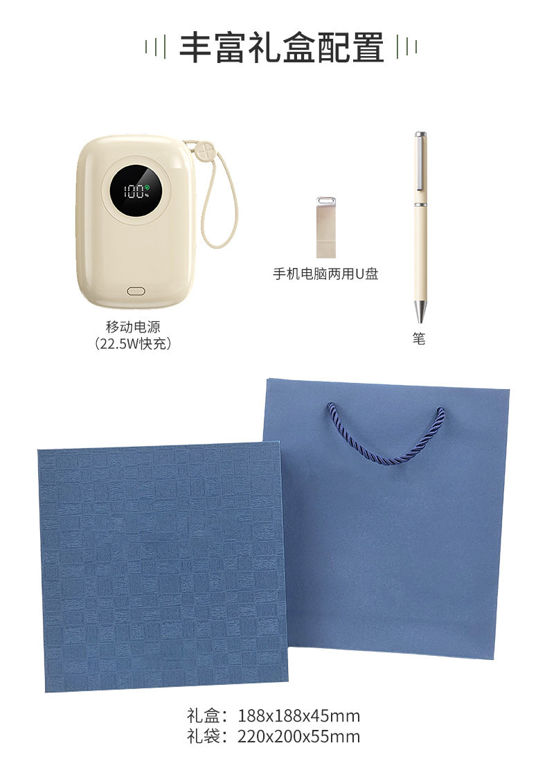 禮盒配置: 1、22.5W超級快充10000mAh自帶線移動電源 2、旋轉(zhuǎn)手機電腦兩用16G U盤(Type-C/USB) 3、金屬烤漆簽字筆 4、包裝盒尺寸:188x188x45mm 5、手提袋尺寸:199x220x55mm 6、重量:28kg/箱